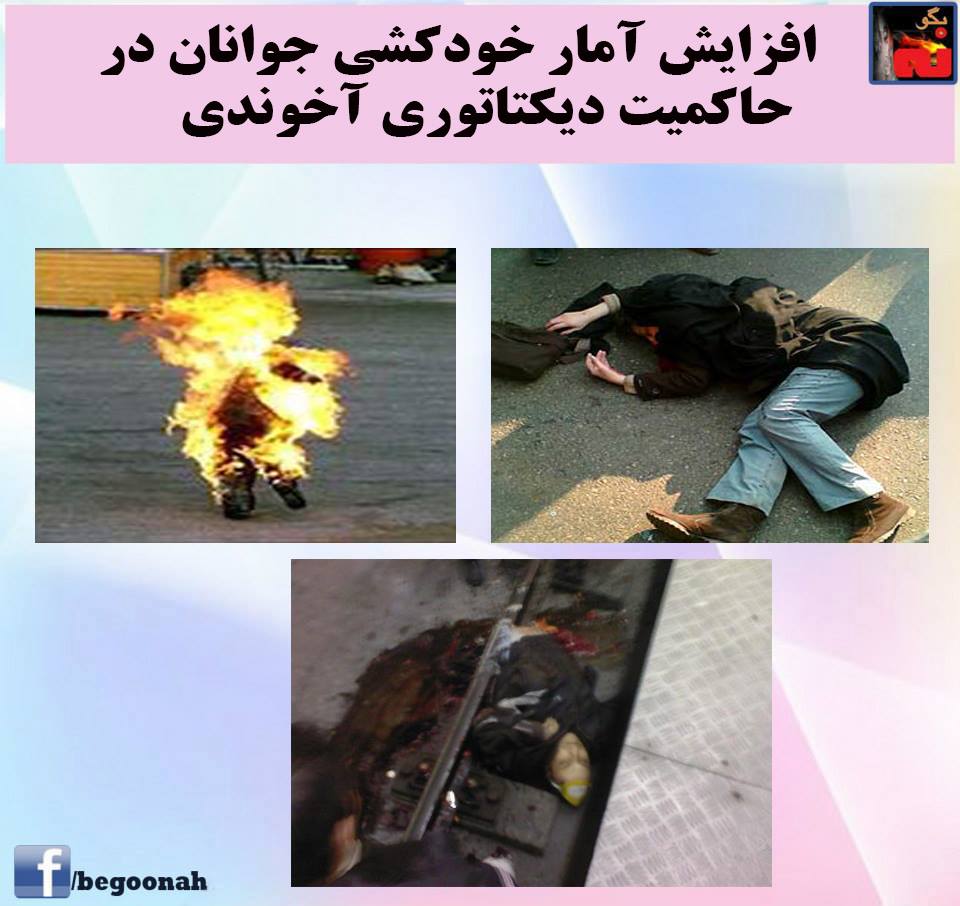 بگونه: مشکلات اجتماعی و اقتصادی، عدم وجود آزادیهای فردی و اجتماعی و افسردگی ناشی از این مشکلات متاسفانه باعث گردیده جوانان در حاکمیت رژیم دیکتاتور و جنایتکار که هر روز سرکوب جوانان را افزایش می دهد،دست به خودکشی بزنند.