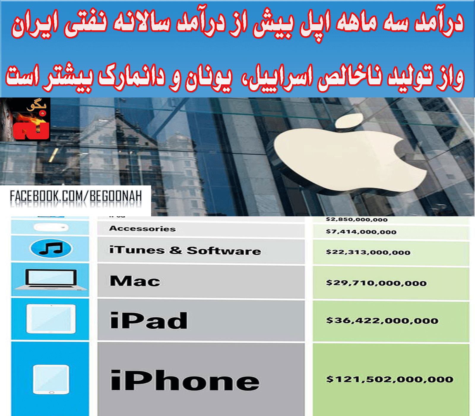 شاید مقایسه فروش محصولات اپل از جمله آیفون با فروش نفت ایران در سال گذشته جالب باشد. بنا بر گزارش بانک مرکزی ایران، در سال ۱۳۹۲ مجموع درآمدهای نفتی ایران ۶۴ میلیارد و ۷۸۹ میلیون دلار بوده است.