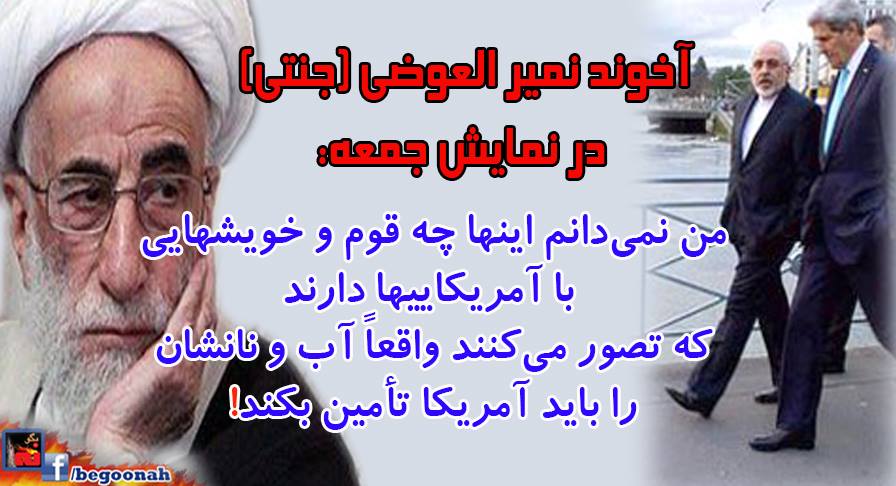 بگونه: آخوند نمير العوضي (جنتي) در نمایش جمعه امروز 9بهمن در تهران باند دزدان رقيب ( روحاني – رفسنجاني ) را بهخاطر تسلیمطلبی و وادادگی در قبال آمریکا مورد حمله قرار داد و گفت: