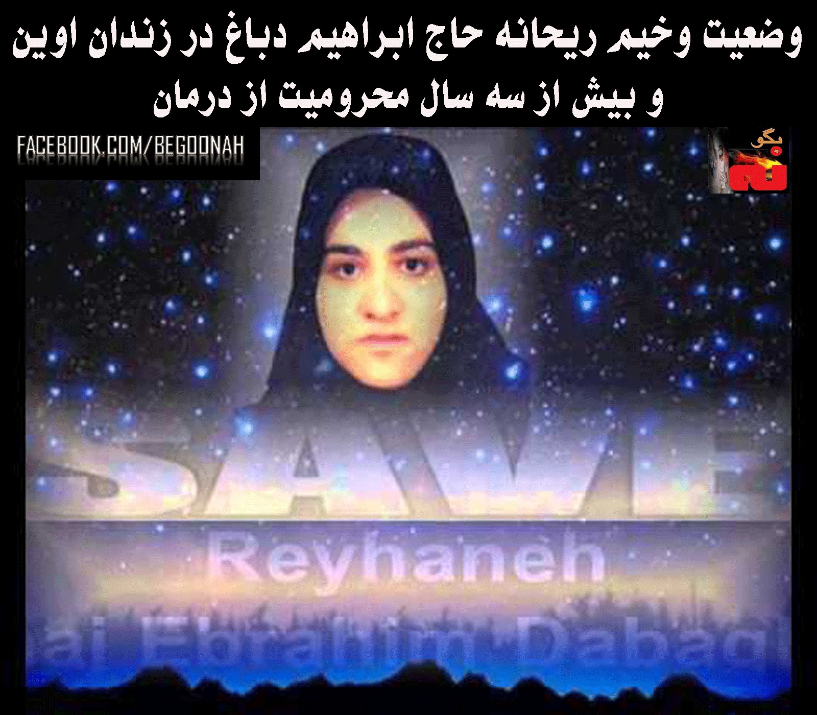بگونه: ریحانه حاج ابراهیم دباغ از زندانيان سياسي در بند نسوان اوین،با وجود بیش از سه سال رنج ناشی از چند بیماری،دژخیمان خامنهای از رسیدگی پزشکی و اعزام وی به مراکز درمانی جلوگيري می کنند.