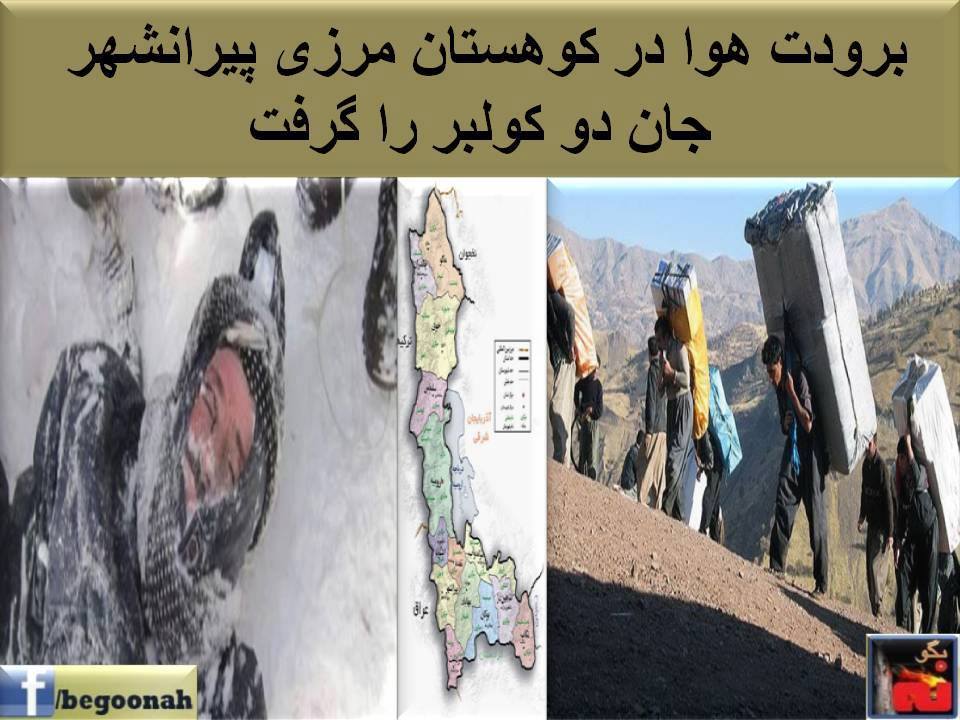 عصر روز پنجشنبه، نهم بهمنماه در کوهستان «بهربنی» و در نزدیکی مکانی به نام «کانی خوا»، در مناطق مرزی پیرانشهر دو کولبر که برای امرار معاش در حال حمل کالا بودند بر اثر سرمازدگی جان خود را از دست دادند. نام این کولبران ابراهیم محمدزاده ٤٠ ساله فرزند احمد و ابراهیم پایمرد ٢٧ ساله فرزند رحمان بوده که دارای همسر و فرزند می باشند. ابراهیم محمدزاده از اهالی روستای «شلیمجاران» و ابراهیم پایمرد نیز اهل روستای «خرنج» از توابع بخش لاجان هستند.