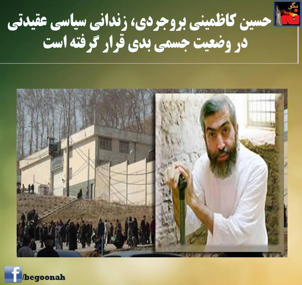 بگونه: زندانی سیاسی عقیدتی آقاي حسين کاظمینی بروجردی در وضعیت جسمی بدی یسر می برد و در طی روزهای اخیر وضعیت ایشان رو به وخامت بیشتری نهاده است.