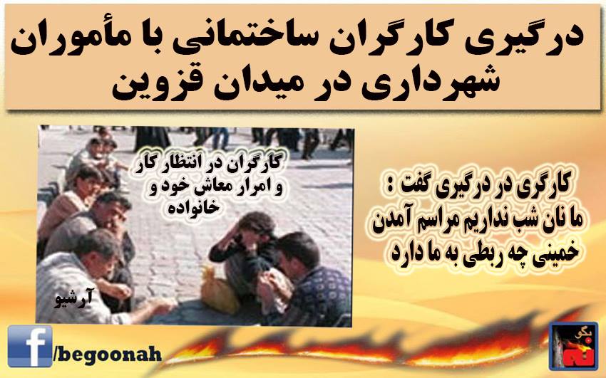 به گزارش رسیده از تهران روز ۱۲بهمن ساعت ۷ صبح تعدادی از کارگران ساختمانی با مأموران شهرداری در میدان قزوین درگیر شدند. مأموران رژیم می خواستند که کارگران زحمتکش که جویای کار روزانه بودند را متفرق کنند تا نمایش دهه ی زجر را برپا سازند اما کارگران جویای کار به حرف مأموران برای متفرق شدن توجه نکردند و در مواجهه به فشار و