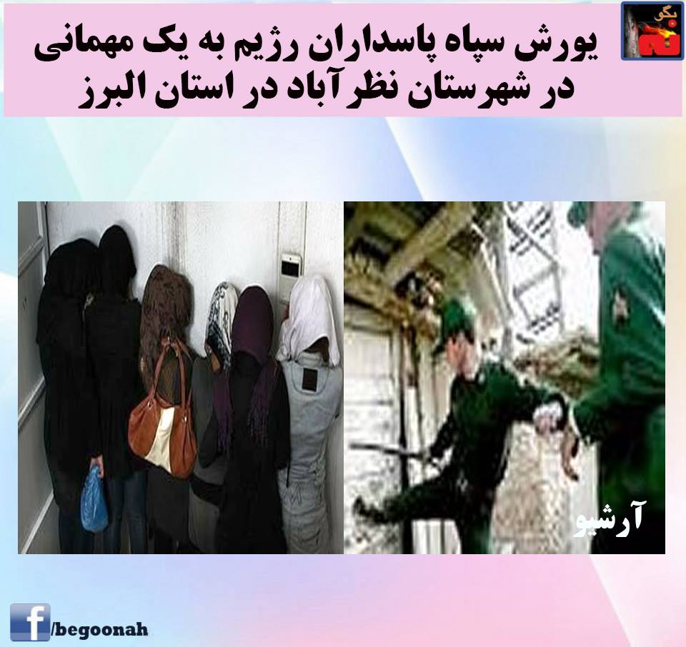 بگونه : بنابر اخبار منتشر شده ،،سپاه پاسداران و نیروی انتظامی سرکوبگر رژیم در یک عملیات مشترک به یک مهمانی در نظرآباد استان البرز یورش بردند و ۴۶ نفر را دستگیر کردند. ۲۲ دختر و۲۴ پسر در میان دستگیر شدگان هستند.