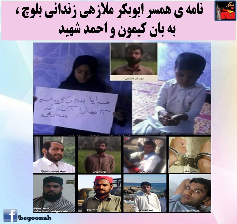 نامه ی همسر ابوبکر ملازهی زندانی بلوچ ،به بان کیمون و احمد شهید