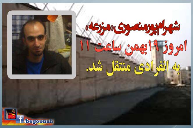 بگونه: تداوم فشار و افزایش شکنجه در زندان ها همچنان ادامه دارد،پس از انتقال افشین بایمانی و ارژنگ داودی به انفرادی های بند سپاه و سپس نا پدید شدن علی معزی و بهنام ابراهیم زاده و انتقال خانم شکری از بند زنان اوین به قرچک و یورش وحشیانه مامورین به سلول و انتقال محمد رضا پور شجری«سیامک»به انفرادی, این بار قرعه بنام شهرام پور منصوری افتاد،شهرام بیش از 14سال و نیم در زندان بدون حق داشتن وکیل و مرخصی درمانی در زندان گوهردشت کرج تبعید است،و مرتبا او و هم پرونده هایش از طرف نهادهای امنیتی مورد تهدید جانی قرار داده می شوند،و در پرونده پزشکی این زندانی بیش از 6بار خودکشی ثبت شده است،این در حالی است که چندی پیش خبرگزاری های حکومتی در اقدامی هماهنگ خبر از صحت و سلامت زندانیان داده بود که هم پرونده های خالد حردانی هستند،این تناقض آشکار در حالی صورت میگیرد که امروز یکشنبه شهرام پور منصوری پس از رفتن به زیر هشت برای پیگیری درمانی بدون اطلاع قبلی و بدون حکم قضایی به انفرادی زندان منتقل می شود،نمایی تمام قد از شکنجه گاهای حکومت ولایت فقیه .