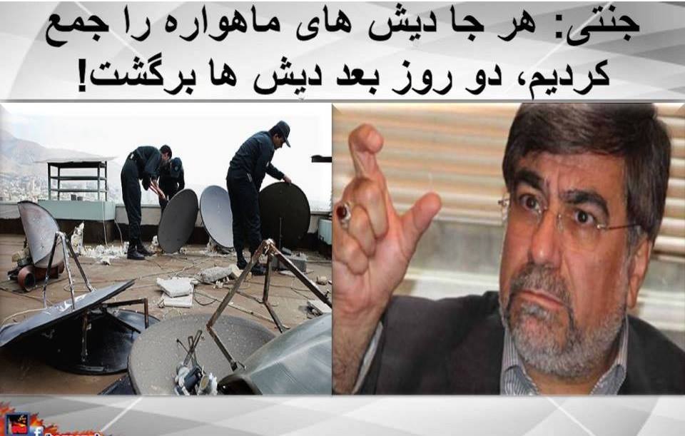 #بگونه: علی جنتی شامگاه شنبه در گرمسار گفته است که : «هر جا دیشهای ماهواره را جمع کردیم، دو روز بعد دیشها برگشت و انگار فقط برای کار و کاسبی نصّابها دیشها را جمع میکنیم.» وی همچنین با اشاره به بینتیجهبودن پارازیتاندازی روی شبکههای ماهوارهای گفت: «در آینده نزدیک، دو هزار شبکه ماهوارهای روی تلفنهای همراه به آسانی توسط قابل دریافت خواهد بود… آیا برای مقابله با این پیشرفتها هم از پارازیت استفاده خواهیم کرد یا راهکاریهای دیگری داریم؟»