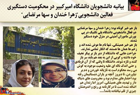 بیانیه دانشجویان دانشگاه امیرکبیر در محکومیت دستگیری فعالین دانشجویی «زهرا خندان و سها مرتضایی»