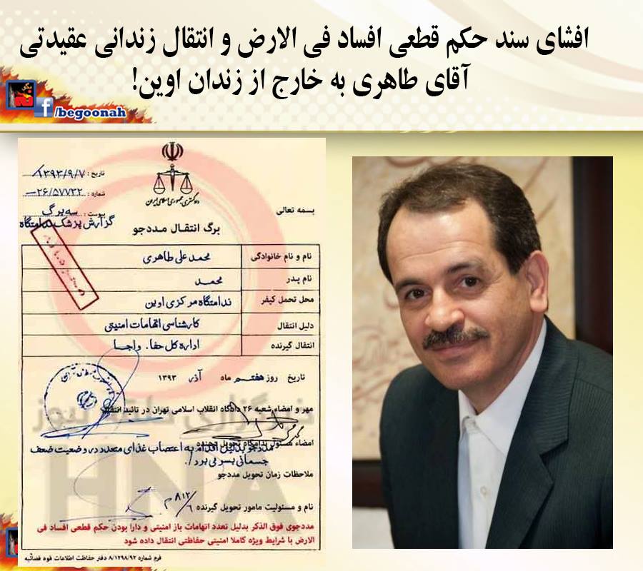 بگونه: بنابر گزارش حلقه نیوز, براساس سند محرمانه زیر، محمد علی طاهری، زندانی عقیدتی، علیرغم این که ادعا میشود همچنان در زندان اوین بسر میبرد و در پی دیدار با وکیل خود در انتظار برگزاری دادگاه برای رسیدگی به اتهام افساد فی الارض در ششم اسفندماه سال جاریست، با حکم قطعی فساد فی الارض که مشخص نیست کی و کجا و در کدام دادگاه و با کدام وکیل مدافع صادر شده، از روز جمعه هفتم آذر ۱۳۹۳، پس از بستری بودن در بهداری زندان اوین به علت عارضه قلبی حاصل از اعتصاب غذا، با حالت ضعف شدید ناشی از اعتصاب غذا، به اداره کل حفاظت اطلاعات وزارت اطلاعات (حفا واجا) تحویل و به مکانی نامعلوم منتقل شده است و طبق پیگیری های به عمل آمده، علیرغم اظهارات خلاف واقع نزدیکان، اطرافیان و وکیل، آقای طاهری تاکنون به زندان اوین بازگردانده نشده اند.