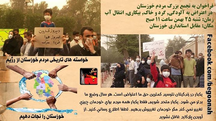 بگونه: «اهواز شهر ماست، هوای پاک حق ماست»، «بهمن ماه یوم الخاک یوم الخاک» و «مسئول بي لياقت استعفا استعفا» اینها شعارهایی است که در سومین تجمع مردم اهواز طی هفته های گذشته در اعتراض به بی مسئولیتی و بی لیاقتی کارگزاران رژیم در مقابل استانداری این شهر سر داده شد.