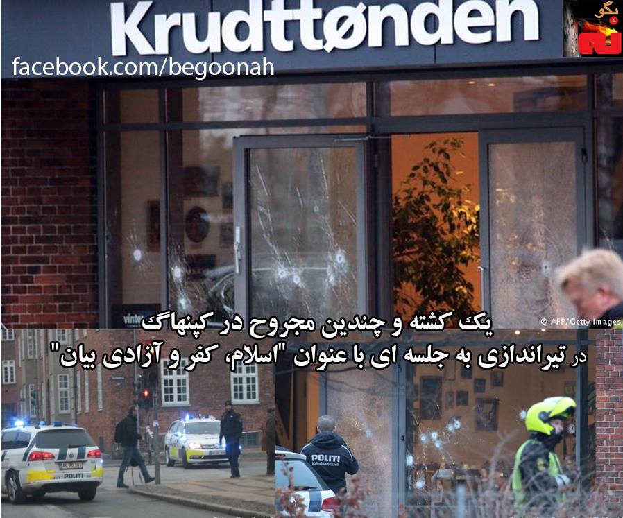 #بگونه :در کافهای در کپنهاگ پايتخت دانمارك جلسه اي با عنوان ” اسلام , كفر و آزادي بيان” و با حضور کاریکاتوریست سوئدی که کاریکاتور پیامبر اسلام را کشیده بودبرگزار گرديد, اما این نشست به صحنهی تیراندازی تبدیل شدو يك نفر كشته و چندين نفر مجروح گرديدند. بنابه اخبار منتشره در اين جلسه قرار بود دربارهی ابعاد واقعهی حمله تروریستی به دفتر مجلهی فرانسوی «شارلی ابدو» نیز بحث و گفتوگو شود.سفیر فرانسه نیز در میان مدعوین بود. فرانسه بلافاصله واکنش نشان داد و این حمله را «تروریستی» دانست.