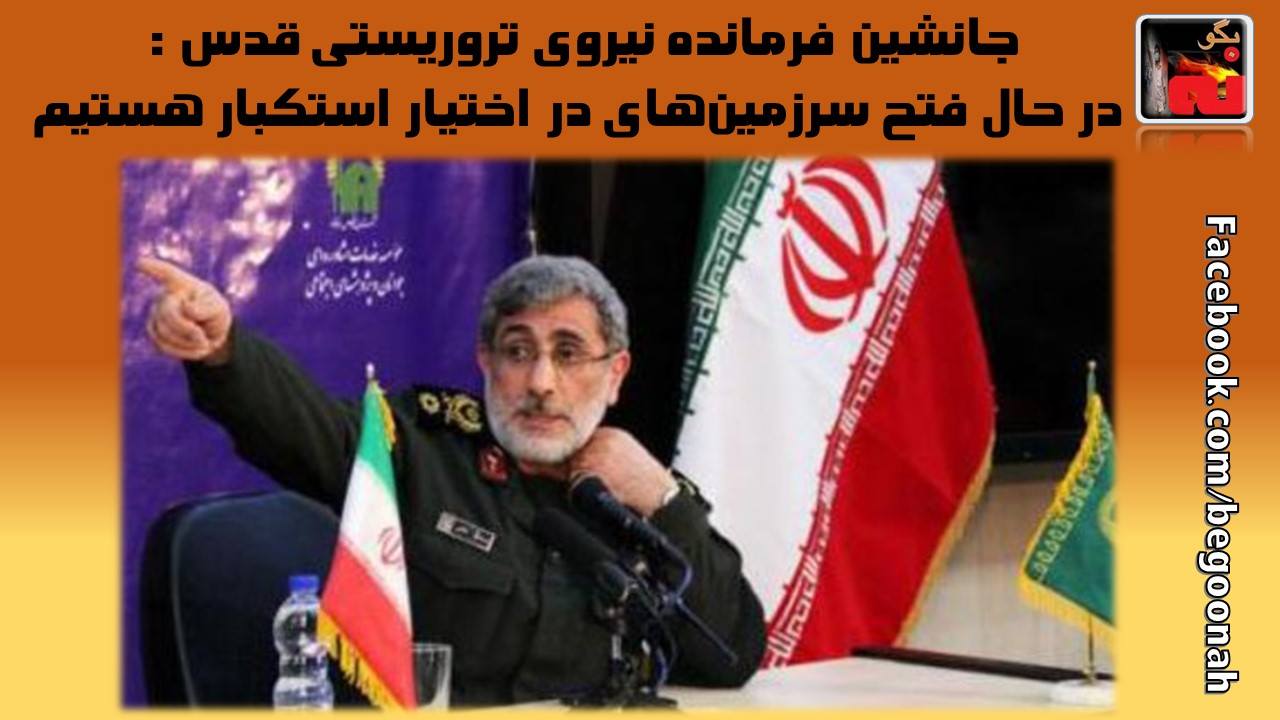 #بگونه: درحالیکه بسیاری از کشورهای منطقه رژیم حاکم بر ایران را متهم به دخالت در امور داخلی این کشورها و آنرا مخل امنیت ملی کشورهایشان می دانند، پاسداراسماعیل قاآنی٬ جانشین سرکرده نیروی تروریستی «قدس» اذعان به تلاش در فتح سرزمینهایی است که وی آنها را در اختیار «استکبار» میخواند.
