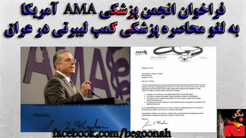#بگونه: انجمن پزشکی AMA در آمريكا كه بیش از ۲۱۷، ۴۹۰ عضو پزشک دارد، در نامه اي به حيدر العبادي نخست وزير عراق فراخوان لغو محاصره پزشکی كمپ لیبرتی محل استقرار اعضاي سازمان مجاهدين خلق ايران را داد كه به دستور رژيم ايران از خدمات پزشكي به ساكنين اين كمپ جلوگيري ميشود و تا كنون شمار زيادي از بيماران به خاطر اين محاصره پزشكي جان خود را از دست داده اند.