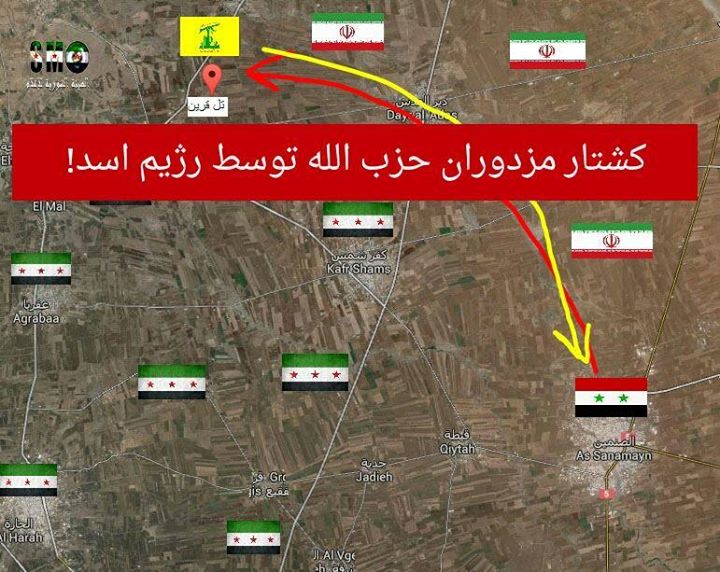 #بگونه: بگزارش منابع عربی نیروهای رژیم اسد اشتباها مرکز تجمع مزدوران حزب الله راکت شلیک می کنند که باعث کشته و زخمی شدن تعداد زیادی از آنها شده و ادوات نظامی و مهمات بسیاری از آنها را نابود می کند. نیروهای حزب الله که تصور می کنند منبع این راکت نیروهای مخالف رژیم هستند در پاسخ شروع به آتش باران می کنند که در نهایت متوجه می شوند نیروهای اسد هستند.