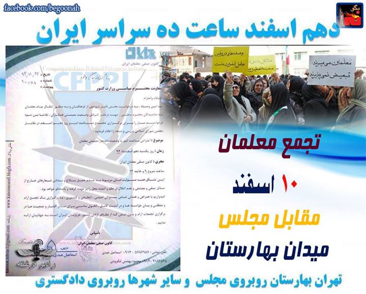 #بگونه: روز سه شنبه پنجم اسفند 93 در جلسه ی هیات مدیره ی کانون صنفی معلمان تصویب شد که تجمع 10 اسفند معلمان در اعتراض به وضعیت نابسامان آموزش و پرورش با استناد به اصل بیست و هفت قانون اساسی برگزار گردد. این کانون با تاکید بر صنفی بودن این اعتراض، اعلام کرده است که چهارشنبه ششم اسفند اعضای هیات رییسه ی کانون صنفی معلمان آقایان محمد تقی فلاحی، اسماعیل عبدی و علی اکبر باغانی به وزارتخانه ی آموزش و پرورش رفته و برای گرفتن یک محل مناسب برای اعتراض مسالمت آمیز معلمان اقدام می نمایند.