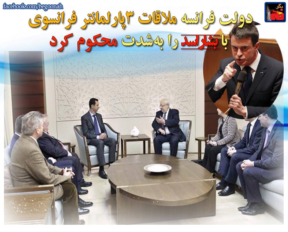 #بگونه: رئیسجمهور و نخستوزیر فرانسه و وزارتخارجه این کشور ملاقات سه پارلمانتر فرانسوی با بشار اسد را محکوم کردند. بگزارش تلویزیون فرانسه 24 سه پارلمانتر خلافکار و پیمان شکن فرانسوی به دمشق سفر کرده و با بشار اسد ملاقات کرده بودند.