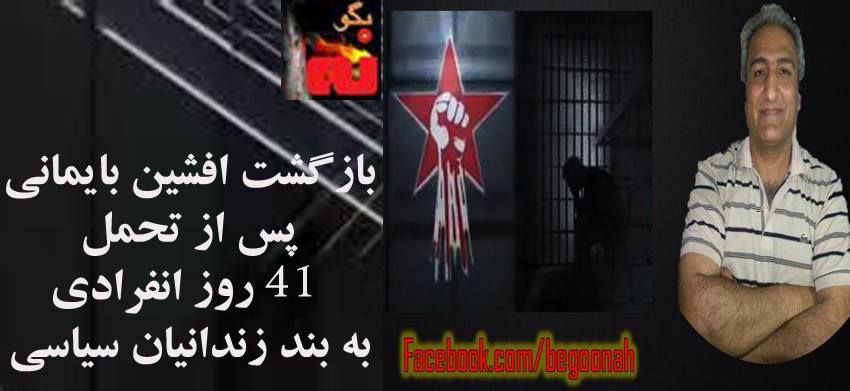 #بگونه: بنابه گزارش رسيده به صفحه فيسبوك بگونه ، زنداني سياسي افشین بایمانی پس از تحمل 41 روز انفرادی و شکنجه در بند سپاه پاسداران در زندان گوهردشت افشین بایمانی صبح امروز يكشنبه 28 دي ماه 1393 همراه با ارژنگ داودي بدلیل موضوعات مبهم و ایزایی به بند اطلاعات معروف به بند سپاه انتقال یافتند.