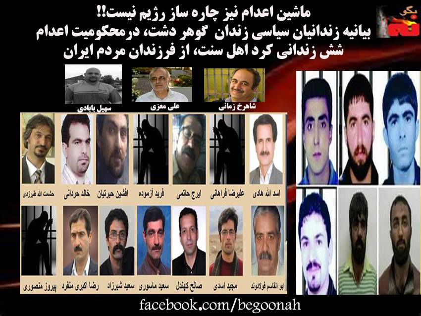 #بگونه: زندانيان سياسي زندان گوهردشت با انتشار بيانيه اي اعدام وحشيانه شش تن از زندانيان عقيدتي كرد اهل سنت ، از فرزندان مردم ايران را محكوم نموده و اين اقدام رژيم را وحشيانه ترين و ضد انساني ترين رفتار در شرايط ضعف و بحران و فروپاشي نام نهادند.