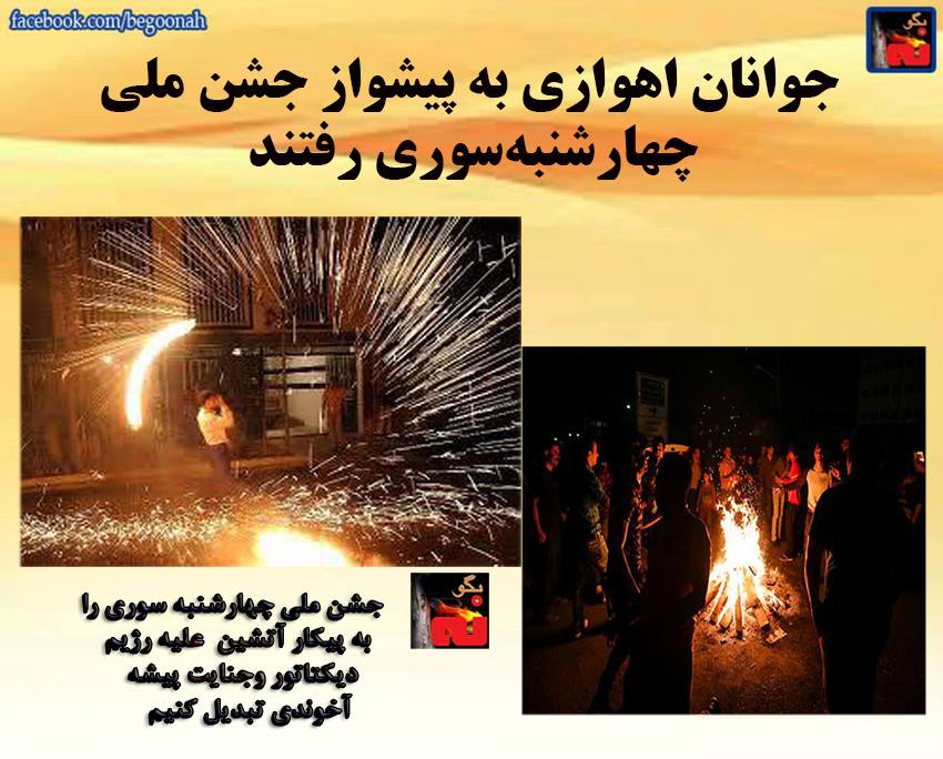 بگونه: ترقه بازی جوانان در میدان چهار شیر اهواز فضای جنگی ایجاد کرده است. جوانان روز جمعه ۲۲ اسفند با انفجار نارنجکهای دستی و ترقهها چهره این منطقه را که ارگانهای مختلف سرکوب در نزدیک آن مستقر هستند ، دگرگون کردند. در اهواز خرید و فروش الزامات چهارشنبهسوری بهرغم منع حکومتی فراوان دیده میشود.