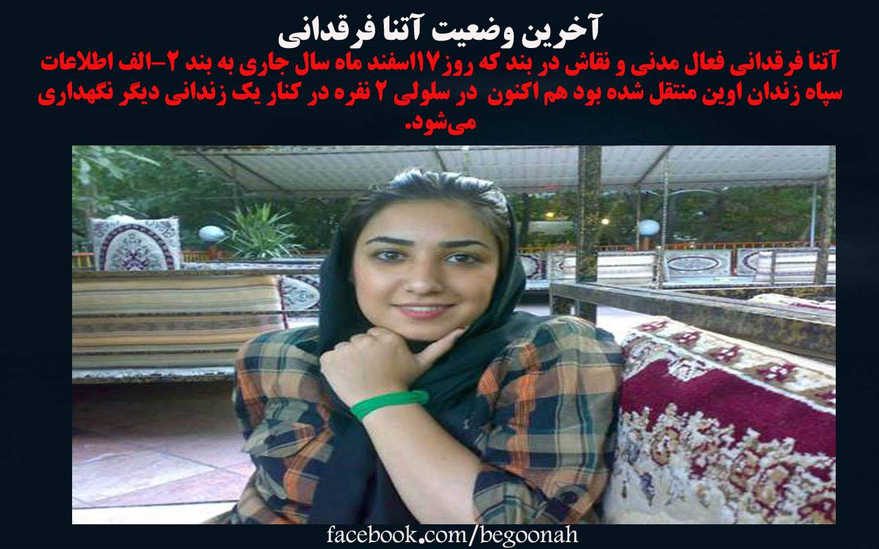 #بگونه:آتنا فرقدانی فعال مدنی و نقاش در بند که روز۱۷اسفند ماه سال جاری به بند ۲-الف اطلاعات سپاه زندان اوین منتقل شده بود هم اکنون در در سلولی ۲ نفره در کنار یک زندانی دیگر نگهداری میشود.