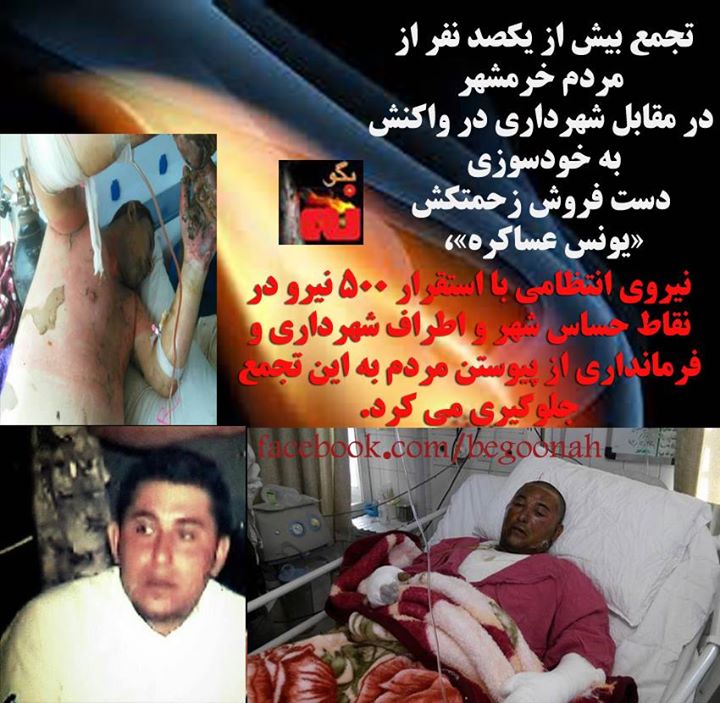 یونس عساکره هنگام مراجعه به محل کار خود، با تخریب دکهاش توسط ماموران نیروی انتظامی و شهرداری روبرو میشود. او با مشاهده این صحنه و فشارهای معیشتی یک گالن بنزین را با خود میبرد و در مقابل ساختمان شهرداری روز شنبه ۱۴ مارس دست به خودسوزی میزند. او هم اکنون در بیمارستان طالقانی با شدت ٩٠٪ سوختگی در بخش مراقبتهای ویژه بستری است.