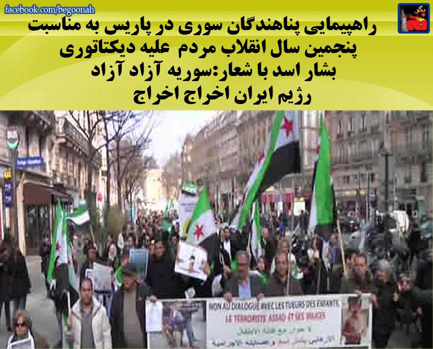 راهپیمایی پناهندگان سوری در پاریس به مناسبت پنجمین سال انقلاب مردم علیه دیکتاتوری بشار اسد با شعار: سوریه آزاد آزاد رژیم ایران اخراج اخراج