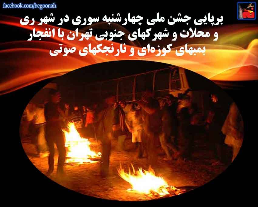 برپایی جشن ملی چهارشنبه سوری در شهر ری و محلات و شهرکهای جنوبی تهران با انفجار بمبهای کوزهای و نارنجکهای صوتی