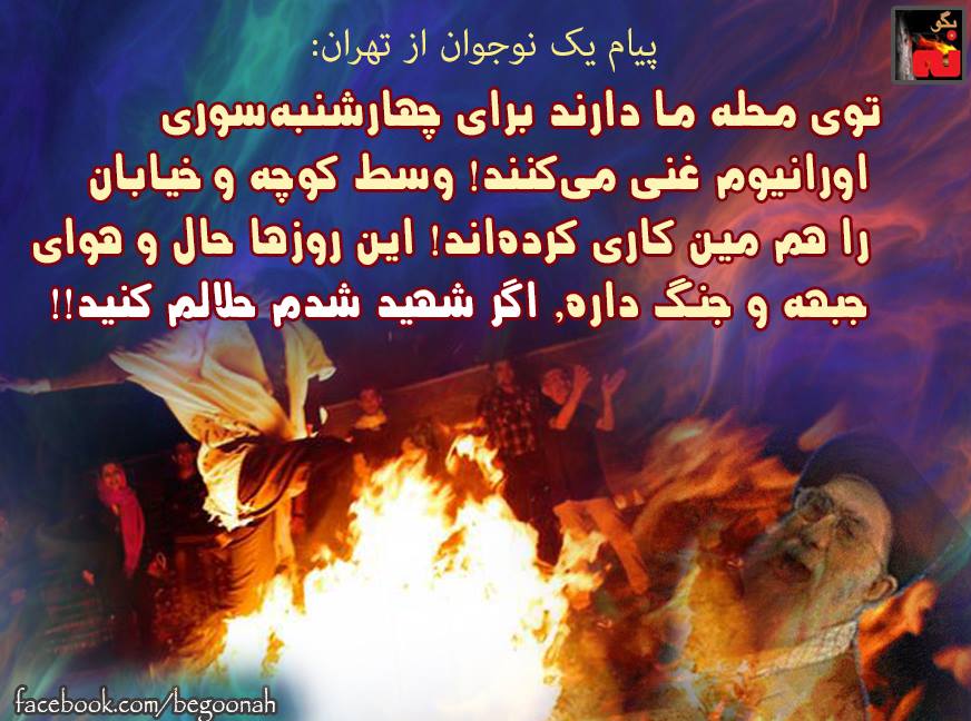 بگونه: در باره حال و هواي تهران و جشن آتشين چهارشنبه سوري اين سنت ديرين و ديرپاي مردم ايران زمين كه در دوران اشغالگران عمامه به سر به جنبشي سرخ و آتشين و ملي عليه اين ايران ستيزان تبديل شده است این جملهای است که یکی از هموطنان تهرانی بيان كرده است: او در صفحه فیس بوکش صحنه را اینطور توصیف نموده : ”توی محله ما دارند برای چهارشنبهسوری اورانیوم غنی میکنند وسط کوچه و خیابان را هم مین کاری کردهاند این روزها حال و هوای جبهه و جنگ داره اگر شهید شدم حلالم کنید!!