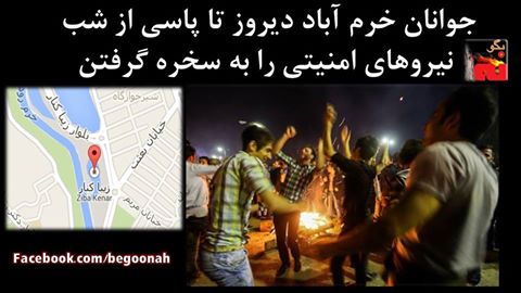 #بگونه : بنابه گزارش دریافتی از خرم اباد ،دیروزسه شنبه 26 اسفند در مراسم چهارشنبه آخرسال در اکثر محلات ودر خیابانهای شهر از جمله زیباکنار،شیرخوارگاه ،قاضی اباد ،میدان کیو و….با وجود جو شدید امنیتی مردم و جوانان نیروهای سرکوبگر را به سخره گرفتند و تا پاسی از شب به جشن و پایکوبی پرداختند .
