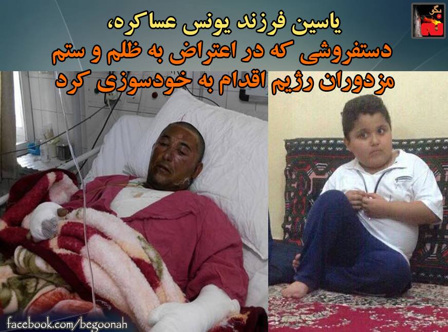 #بگونه: یونس عساکره، کارگر دستفروش خرمشهری که در اعتراض به مزاحمت هاى مأمورین شهردارى و تخریب دکه اش خودسوزى کرده بود، با وخیم شدن وضعیت به بیمارستانى در تهران منتقل شده است. پزشکان معالج آقاى عساکره با تشخیص ٩٢درصد سوختگى درجه یک، وى را براى ادامه درمان به تهران منتقل کردند.طبق آخرین گزارشات در خصوص وضعیت یونس «خون ریزی داخلی قلب و ریه ها مشاهده شده اما به دلیل سوختن رگ ها و حتی عصب های یونس، امکان گرفتن خون برای آزمایش نیست.»