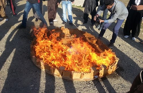 هنگام آتش زدن این ماکت چندین هنرمند کُرد به نشانه حمایت از کمال عزیزی حضور داشتند.