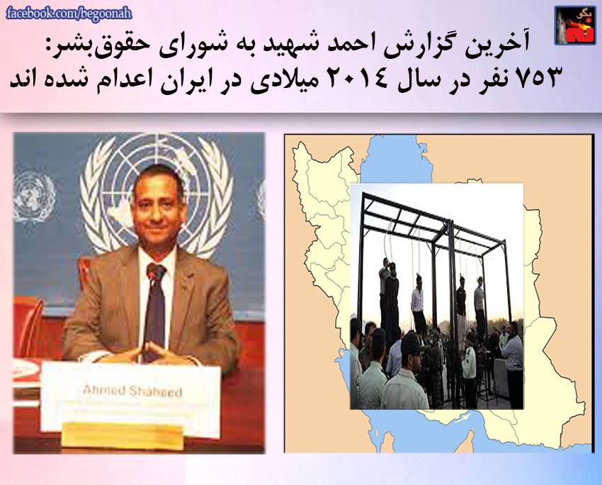 بگونه : احمد شهید گزارشگر ویژه حقوقبشر برای ایران، گزارش خود از وضعیت حقوقبشر در رژیم ایران را به شورای حقوقبشر سازمان ملل تقدیم کرد. بر اساس این گزارش در سال ۲۰۱۴ میلادی ۷۵۳ نفر در ایران اعدام شدهاند. تنها در ۱۰ هفته اول سال ۲۰۱۵ نیز ۲۵۲ نفر بدار آویخته شدهاند. همچنین حداقل ۱۳ زندانی زیر ۱۸ سال نیز در سال ۲۰۱۴ اعدام شدهاند. اکثریت این افراد بهدلیل جرایمی که طبق قوانین بینالمللی جزو جرایم سخت شناخته نشده و مستوجب اعدام نیستند، محکوم به مرگ شدهاند.