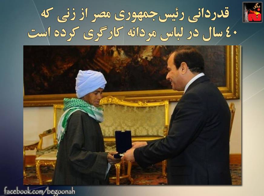 #بگونه: يك زن زحمتكش مصري كه که ۴۰ سال در لباس مردانه کارگری کرده است مورد تجلیل و قدردانی عبدالفتاح سيسي رئيس جمهور مصر قرار گرفت. بنابه اخبار منتشره «صیصه جابر ابو دوح دوم فروردین / ۲۲ مارس به کاخ ریاستجمهوری در قاهره رفت تا جایزهی خود را از عبدالفتاح سیسی دریافت کند.