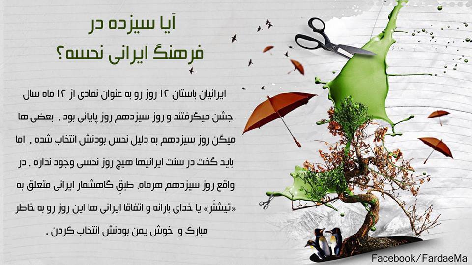 #بگونه: جشن نوروز سلسله اي از رسم ها وسنت هاست. جشني كه با چهارشنبه سوري به پيشوازش ميريم وبعد از 12 روز جشن و شادي با سيزده بدر بدرقه اش ميكنيم. ايرانيان باستان 12 روز رو به عنوان نمادي از 12 ماه سال جشن ميگرفتند و روز سيزدهم روز پاياني بود. بعضي ها ميگن روز سيزدهم به دليل نحس بودنش انتخاب شده. اما بايد گفت در سنت ايرانيها هيچ روز نحسي وجود نداره.در واقع روز سيزدهم هرماه، طبقِ گاهشمار ايراني متعلق به «تيشتَر» يا خداي بارانه و اتفاقا ايراني ها اين روز رو به خاطر مبارك و خوش يمن بودنش انتخاب كردن. اما عده اي هم ميگن اعتقاد به نحس بودن روز سيزده از اين به وجود اومده كه آرش كمانگير بعد از رها كردن تيرش در روز سيزدهم تير جونش رو از دست ميده. عده اي ديگه هم اعتقاد دارن اين روز از ابتدا نحس نبوده اما بعد از حملات تازي ها به ايران بعضي از روزها رو نامبارك مي دونستن كه يكي از اونها روز سيزدهم بوده.