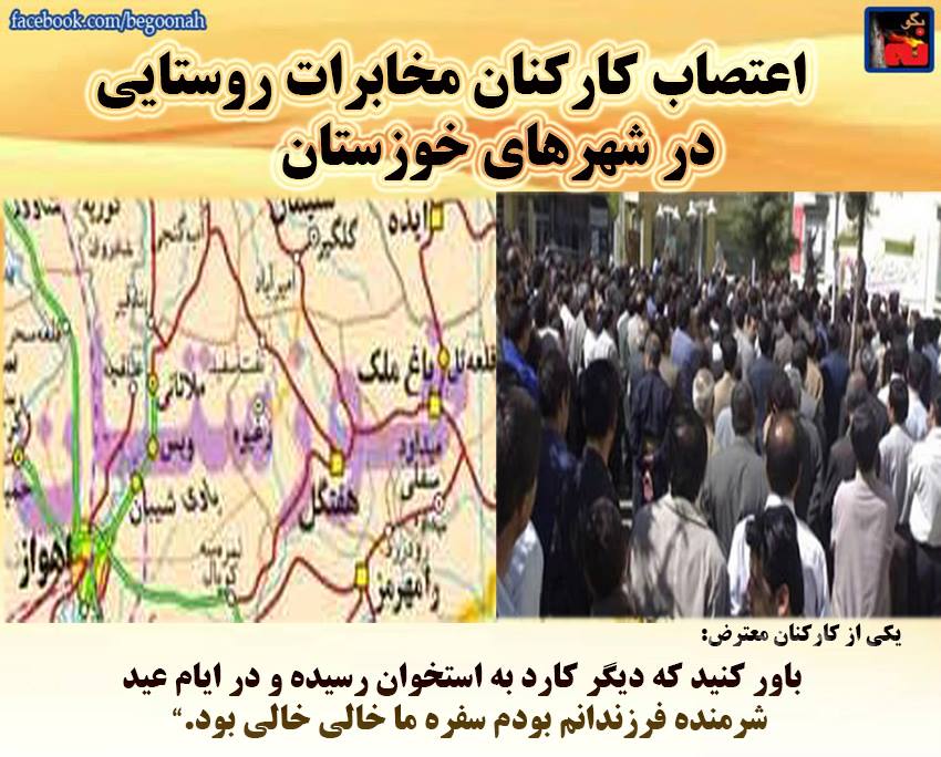 بگونه : بنا به گزارش ایران کارگر، روز يكشنبه ۹ فروردين كاركنان مخابرات روستايي در شهرهاي مختلف استان خوزستان در اعتراض به عدم دريافت بيش از يكسال حقوق و مزايا و مطالبات معوقه خود دست از كار كشيده و عليرغم مختل بودن سيستمهاي ارتباطي بر سر كار حاضر نشدند. بنا به گفته يكي از كاركنان معترض: ”به ما فقط وعده و وعيد ميدهند و ميگويند وضعيت مملكت بهم ريخته هست ولي شما كار كنيد … اما باور كنيد كه ديگر كارد به استخوان رسيده و در ايام عيد شرمنده فرزندانم بودم سفره ما خالي خالي بود.”