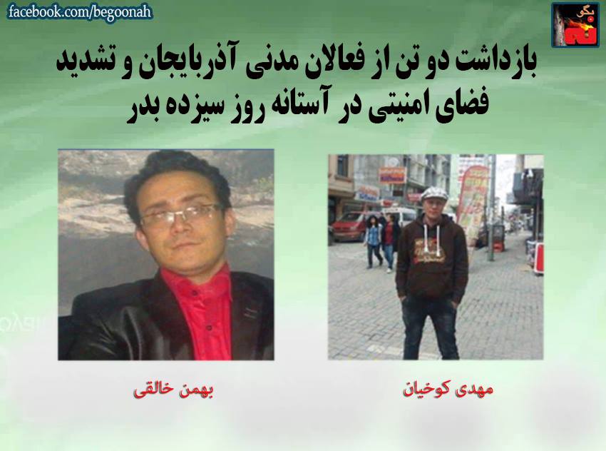 چهارشنبه ۱۲فروردین۹۴ در آستانه روز طبیعت بهمن خالقی و مهدی کوخیان دو نفر از فعالان مدنی آذربایجان در محل کار بهمن خالقی در شهر بناب از سوی ماموران امنیتی بازداشت و به اداره اطلاعات این شهر منتقل شدند.