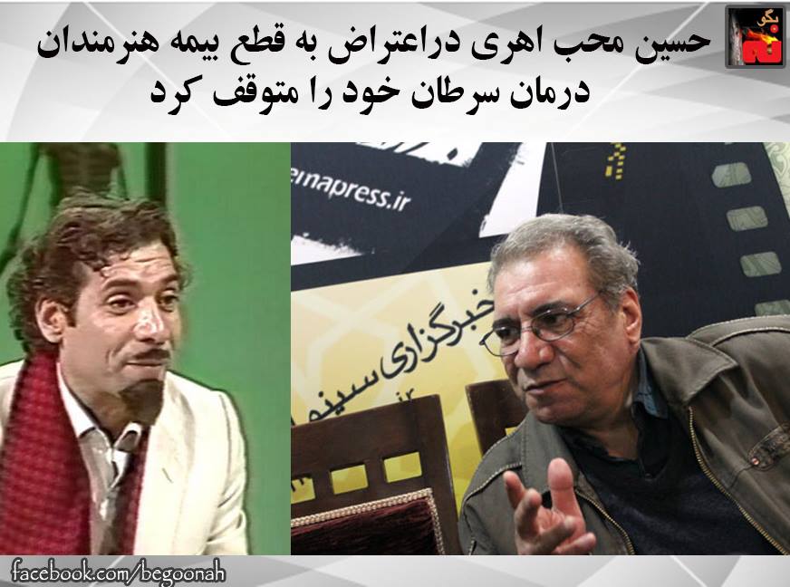 #بگونه: حسین محب اهری هنرمند تئاتر ایران، که پس از ۱۰ سال دوباره به سرطان غدد لنفاوی مبتلا شده اعلام کرد که به دلیل قطع بیمه تکمیلی هنرمندان و قطع کمک هزینه درمان از سوی صدا و سیما، به دلیل این که توان پرداخت هزینههای درمان خود را ندارد، از ادامه درمان خودداری کرده است.