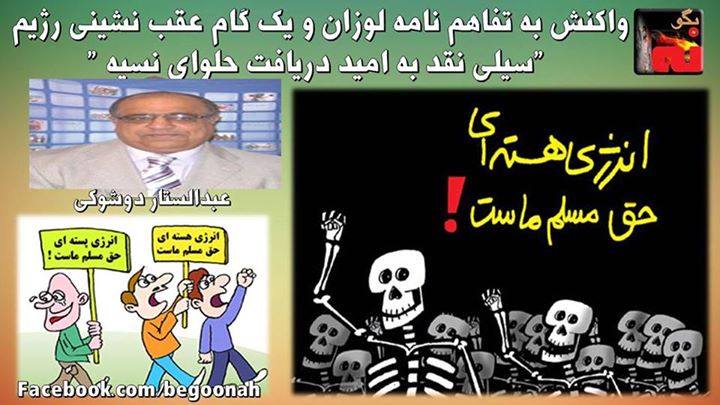 #بگونه: عبدالستار دوشوكي ضمن تبريك و تمجيد از وزير خارجه شياد و جنايتكار رژيم و موفقيت وی و آخوند روحانی براي گوارا كردن نوشيدن جام زهر براي ولي فقيه در مقاله اي در سايت العربيه فارسي مي نويسد:” تفاهم هسته ای بین ایران و قدرت های جهانی برای نظام جمهوری اسلامی که تا به امروز صدها میلیارد دلار هزینه ماجراجویی هسته ای کرده است، هیچ برهان نمایی و توجیه ای جز نوشیدن جام زهر هسته ای ندارد. اما برای ملت ایران حقا خبر بسیار سودبخش و خوشحال کننده ای است. زیرا جلوی ضرر را از هر کجایی که بگیری منفعت است. اگرچه در بیانیه مطبوعاتی محمد جواد ظریف و فدریکا موگرینی مسئول سیاست خارجی اتحادیه اروپا اشاره ای به جزئیات تفاهم نامه نشده است، اما از سخنرانی ٢٠ دقیقه ای رئیس جمهور آمریکا و اظهارات و جزئیات ارائه شده توسط وزیر خارجه آمریکا در کنفرانس مطبوعاتی اینگونه به نظر می رسد که ایران به امید دریافت حلوای نسیه در ده سال آینده سیلی نقد خورده است. در برخی از موارد ایران حتی باید تا ٢٥ سال صبر کند.