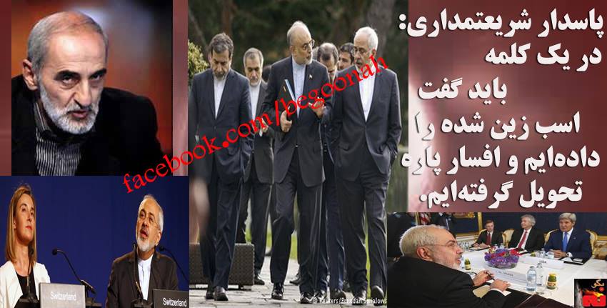#بگونه:پاسدار شریعتمداری نماینده خامنهای در کیهان در مصاحبه با خبرگزاری فارس وابسته به سپاه پاسداران رژيم درباره تفاهم لوزان و ”يك گام عقب نشيني تحمیلی دیگر رژيم ” در یک بیانیه با کلیات بدون امضا و تأیید رسمی خامنهای، گفت: در یک کلمه باید گفت اسب زین شده را دادهایم و افسار پاره تحویل گرفتهایم. نام توافق دو مرحلهای را بیانیه مطبوعاتی گذاشتیم.