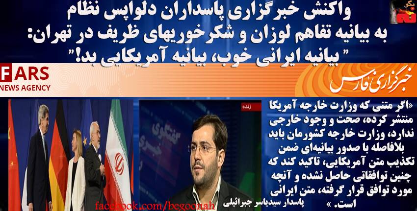 واكنش خبرگزاري پاسداران دلواپس نظام به بيانيه تفاهم لوزان و شكرخوريهاي ظريف در تهران: ” بیانیه ایرانی خوب، بیانیه آمریکایی بد!”