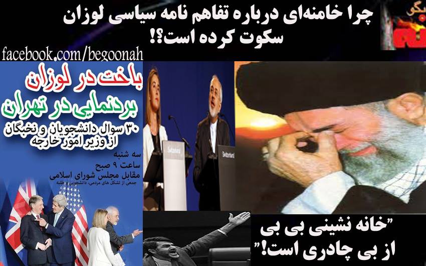 #بگونه: در حاليكه جنگ و جدال بين باندهاي رژيم پس از يك گام عقب نشيني تحميلي و زهرخوران لوزان بالا گرفته و به گونه اي است كه هيچ سگي صاحب خود كه ولي فقيه باشد را نمي شناسد، خامنه اي هنوز در سكوت مطلق است. دلواپسان نظام دليل سكوت ولي فقيه عليل نظام چهار روز پس از اعلام تفاهم اتمی با کشورهای غربی در حاليكه رئيس جمهور آمريكا بلافاصله راجع به اين تفاهم واكنش نشاند داد و سخنراني كردو واکنشها و اظهار نظرها در خارج و داخل ایران درباره این تفاهم همچنان ادامه دارد را در چه مي بينند؟