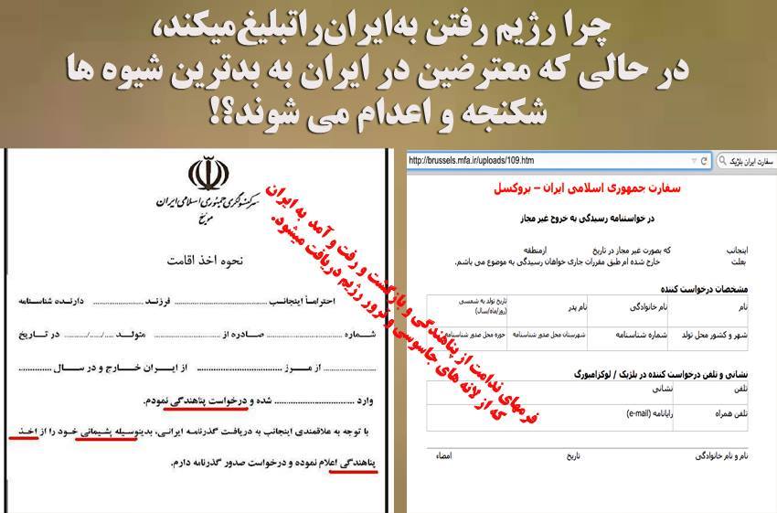 در حاليكه معترضين در ايران به بدترين شيوه ها شكنجه مي شوند، ايراني پناهنده خارج كشور كه در پرونده پناهندگی اش مدعي شده تحت تعقيب و جانش در خطر بوده و …پس از آنكه ”به حرمت خون آن همه دلاور، دروغ هایش را باور می کنند و اجازه اقامت برايش صادر می کنند.پناهندگي و اقامتش را گرفت ،آنگاه طرف با ویزا و پاسپورت قانونی می دود و به ايران مي رود. وقتی هم ازش می خواهی که در یک حرکت حقوق بشری شرکت کند، قبول نمی کند. می گوید می ترسم نتوانم دوباره به ایران سر بزنم.” ﭼﺮا ﺭﮊﻳﻢ ﺭﻓﺘﻦﺑﻪاﻳﺮاﻥﺭاﺗﺒﻠﻴﻎﻣﻴﻜﻨﺪ؟ – اﻭﻻ ﻛﻪ ﺯﻳﺮآﺏ ﭘﻨﺎﻫﻨﺪﮔﻲ ﺭا ﺑﺰﻧﺪ و ﻫﻢ ﻛﻨﺘﺮﻝ ﺧﻮﺩ ﺭا ﺑﺮاﻱ ﭘﺎﺳﻴﻮ ﻛﺮﺩﻥ اﻳﺮاﻧﻴﺎﻥ ﺧﺎﺭﺝ اﺯ ﻛﺸﻮﺭ ﺩاﺷﺘﻪ ﺑﺎﺷﺪ. اﻳﻦ ﺭﻭﺯﻫﺎ اﻳﺮاﻧﻴﺎﻥ ﺩاﺧﻞ ﻛﺸﻮﺭ ﺑﺎ ﺗﻤﺎﻣﻲ ﺧﻂﺮاﺕ ﻫﺮ ﺭﻭﺯ ﺩﺭ اﻋﺘﺮاﺽ و اﻋﺘﺼﺎﺏ…ﺑﺎ ﺭﮊﻳﻢ ﻣﺒﺎﺭﺯﻩ ﻣﻲ ﻛﻨﻨﺪ ﻭﻟﻲ اﻳﺮاﻧﻴﺎﻥ ﻋﺰﻳﺰ ﺧﺎﺭﺝ اﺯ ﻛﺸﻮﺭ اﺯ ﺷﺮﻛﺖ ﺩﺭ ﻳﻚ ﺗﻆﺎﻫﺮاﺕ ﺧﺎﺭﺝ اﺯ ﻛﺸﻮﺭ ﻋﻠﻴﻪ ﺁﺧﻮﻧﺪﻫﺎ ﻣﻲ ﺗﺮﺳﻨﺪ ﭼﺮا ﻛﻪ ﻣﻤﻜﻦ اﺳﺖ ﺭﻓﺘﻦ ﺑﻪ اﻳﺮاﻥ ﺭا ﺗﻬﺪﻳﺪ ﻛﻨﺪ. – گزارش مشترك كنگره و وزارت دفاع آمريكا در ديماه91 (دسامبر2012 ) درباره عملكرد وزارت اطلاعات رژيم ايران و شيوه هاي آن تصريح ميكند: «وزارت اطلاعات به جوامع ايرانی خارج از ايران از طريق انواع روش ها نفوذ ميكند. به عنوان مثال، يك انجمن به نام «حمايت از پناهندگان ايرانی» در پاريس جهت عضوگيري پناهجويان ايرانی براي جاسوسي ايرانيان در فرانسه به كارگرفته ميشود». گزارش خاطرنشان ميكند: «دولت ايران مجاهدين خلق را سازماني كه بيشترين تهديد را براي جمهوری اسلامی ايران ايجادكرده، تلقی ميكند. يكي از اصليترين مسئوليتهای وزارت اطلاعات انجام عملياتهای مخفی عليه مجاهدين خلق و شناسايی و از بين بردن اعضای آن است…اين وزارتخانه داراي بخش دروغپراكنی است، كه مسئول توليد و انجام جنگ رواني عليه دشمنان جمهوري اسلامی است» اما هر ایرانی با شرفی خود خوب می داند که چه کسانی تاوان آن را پرداخت میکنند؟ قطعاً ﭘﻨﺎﻫﻨﺪﮔان ایرانی، پناهنده ای كه پس از دريافت حق پناهندگي به ايران زير ستم و سركوب آخوندهاي ضد ايراني مي رود به حق پناهندگي به قوانين پناهندگي، به پناهندگان ايراني و به مردم ايران خيانت مي كند و این بی شرمی و خیانت را نمی توان با هیج چیز پاک كرد، مگر اينكه صادقانه از مردم ايران پوزش خواست و اين عمل زشت و آخوند پسند را محكوم نمود و ترك كرد.