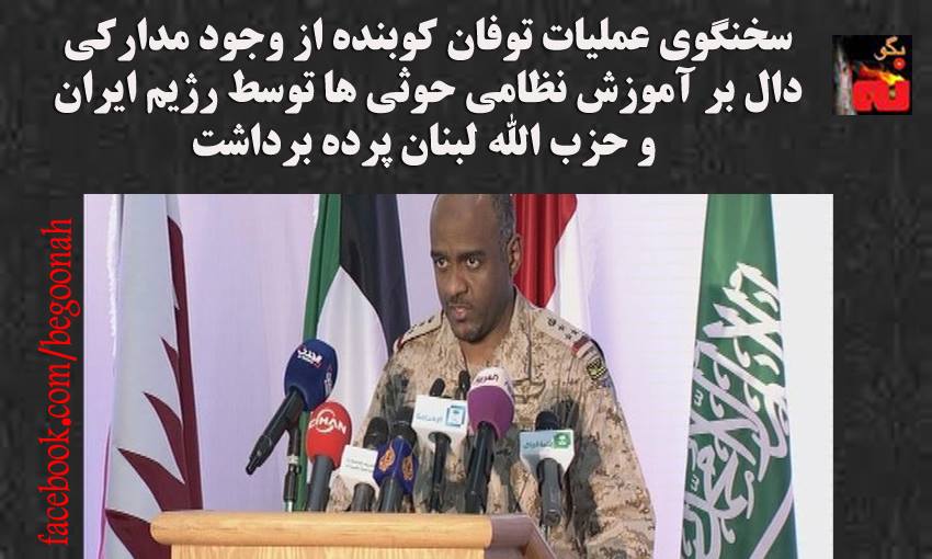 #بگونه: سرتیپ احمد عسیری سخنگوی رسمی عمليات توفان كوبنده در گزارش امروز خود درباره عملیات جاری در یمن در دفاع از مشروعیت در این کشور از وجود مدارکی دال بر آموزش نظامی حوثی ها توسط رژيم ایران و حزب الله لبنان پرده برداشت.