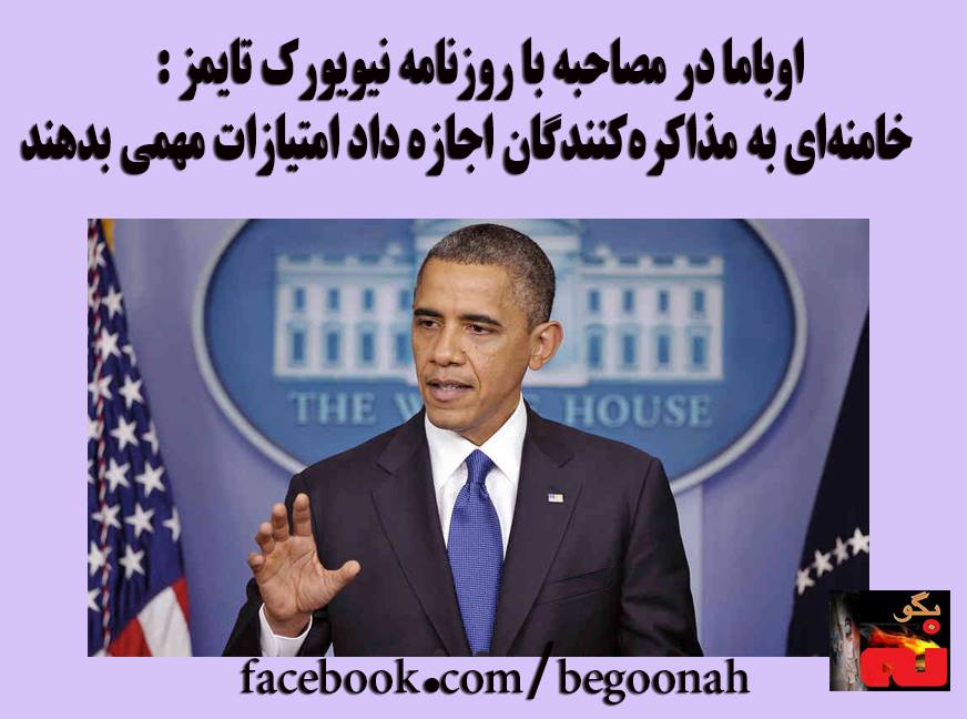 اوباما در مصاحبه با روزنامه نیویورک تایمز گفت :خامنهای به مذاکرهکنندگان اجازه داد امتیازات مهمی بدهند
