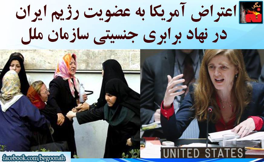 #بگونه: با توجه به وضعیت نابسامان برابری جنسیتی در ایران نماینده آمریکا به انتخاب نماینده رژیم ایران در نهاد برابری جنسیتی سازمان ملل اعتراض نمود. نماینده ایالات متحده در سازمان ملل متحد از نقض حقوق زنان در ایران انتقاد کرد و گفت که نماینده ایران برای عضویت در نهاد سازمان ملل در مبارزه برای برابری جنسیتی، شایستگی ندارد.خانم پاور افزود: «در ایران، قانون به زنان اجازه انتصاب در برخی از مقامهای دولتی را نمیدهد، قانونی علیه خشونت خانگی وجود ندارد، و زنا را با سنگسار تنبیه میکنند.»او ادامه داد: «و این موارد باعث میشود که برعهده گرفتن نقش ریاستی توسط ایران در زمینه رفاه و حقوق زنان در سازمان ملل امری کاملاً نابهجا باشد.»