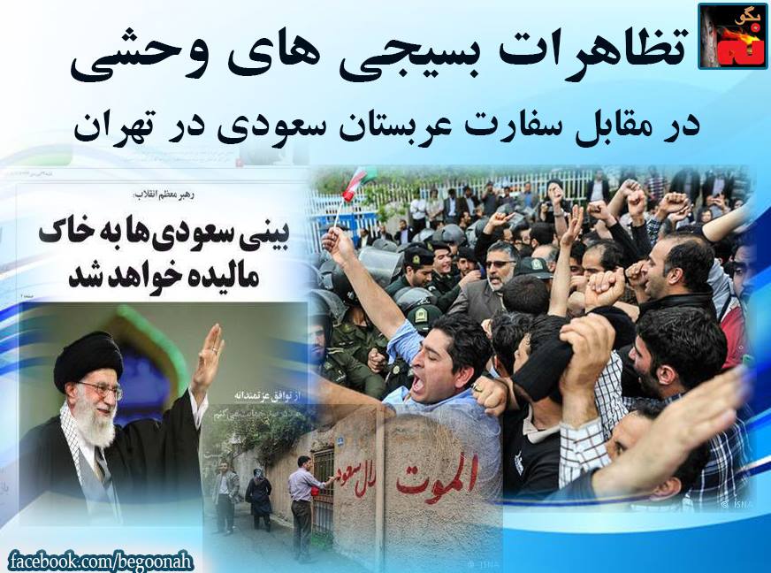 #بگونه: بگزارش آسوشیتدپرس بیش از ۳۰۰ نفر از بسیجیان خامنه ای در برابر سفارت عربستان در شمال تهران در روز شنبه (۲۲ فروردین/ ۱۱ آوریل) تجمع کرده و خواستار بسته شدن سفارت شدند.