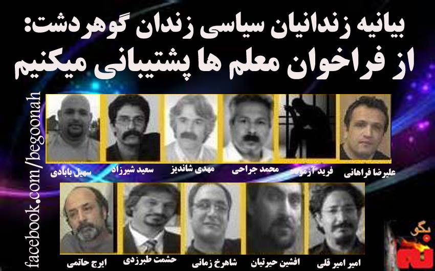 #بگونه: زندانيان سياسي زندان گوهردشت كرج با انتشار بيانيه اي از فراخوان معليمن و فرهنگيان براي تجمع اعتراضي در سراسر كشور حمايت كردند.