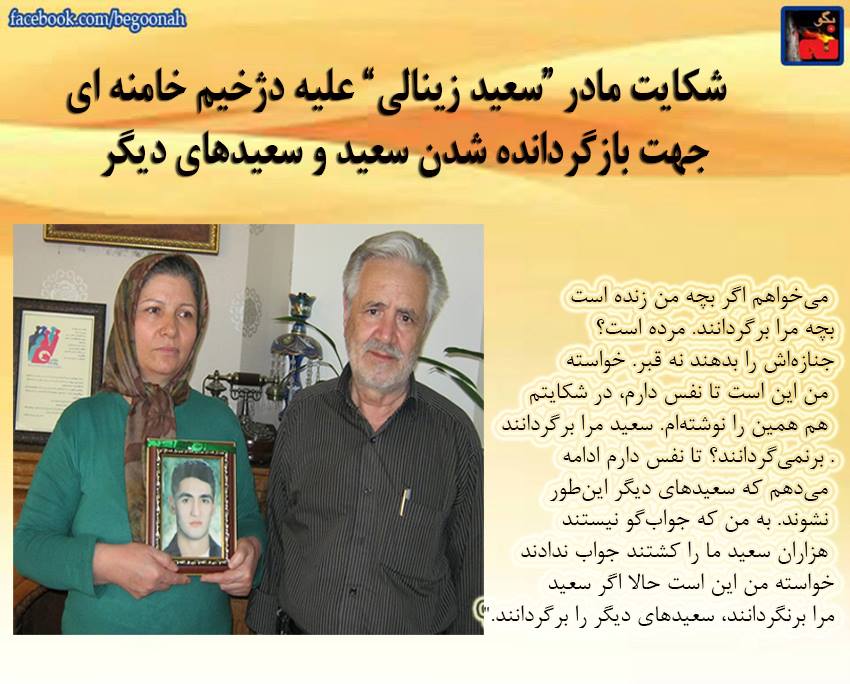 شکایت مادر سعید زینالی علیه دژخیم خامنه ای جهت بازگردانده شدن سعید و سعیدهای دیگر