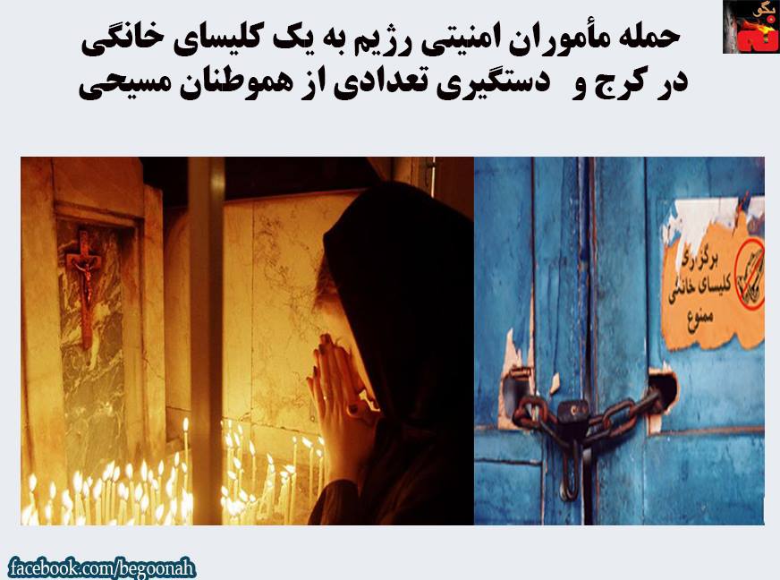 بگونه : به گزارش رسیده از کرج روز جمعه 21فروردین یک کلیسای خانگی در شهرستان کرج مورد حمله مأموران امنیتی رژیم قرار گرفت، در جریان این حمله به کلیسای خانگی تعدادی از هموطنان مسیحی که در حال نیایش بودند دستگیر شدند و مأموران مزدور با
