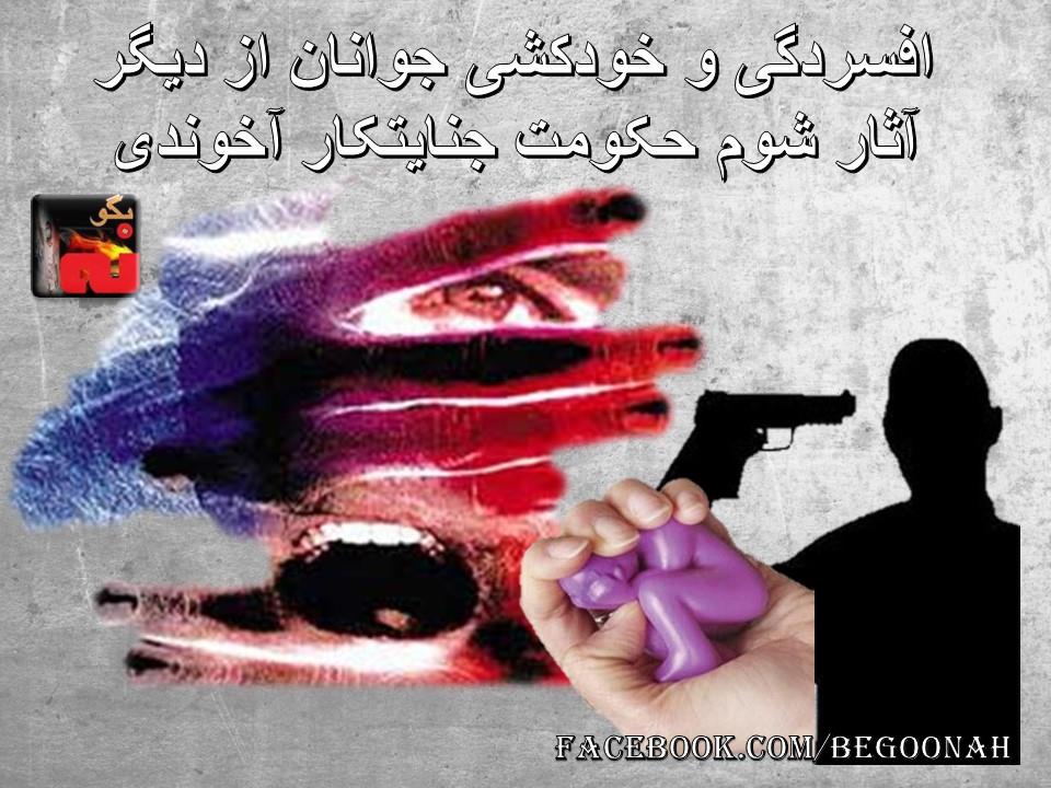 بگونه: نتیجه 37 سال حکومت آخوندی در ایران، جدا از گسترش و دامنه شدید فقر و بیکاری و اعتیاد و فحشا در کشور، گرایش افراد و بویژه جوانان بسوی دلمردگی و در نهایت افسردگی است که در موارد بسیاری منجر به خودکشی و یا خودسوزی این سرمایه های ملی کشور می شود.